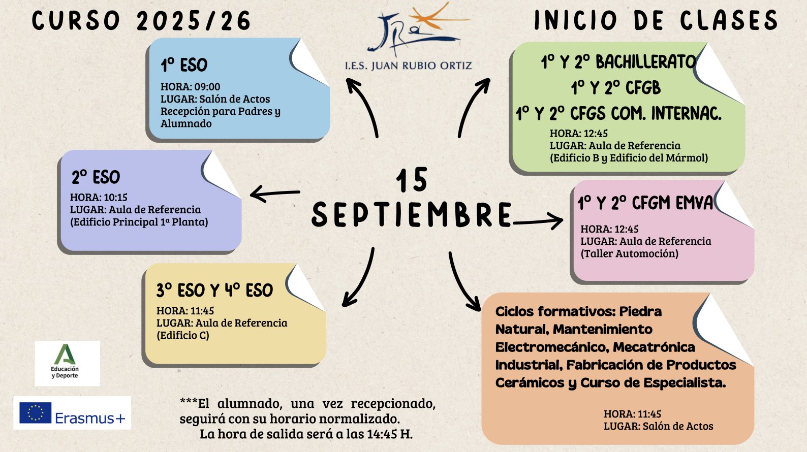 - 12:45 – Bachilleratos, Ciclos Formativos de Grado Básico, Comercio Internacional y Automoción. Aula de referencia (Edificio B, Edificio Mármol y Taller Automoción).